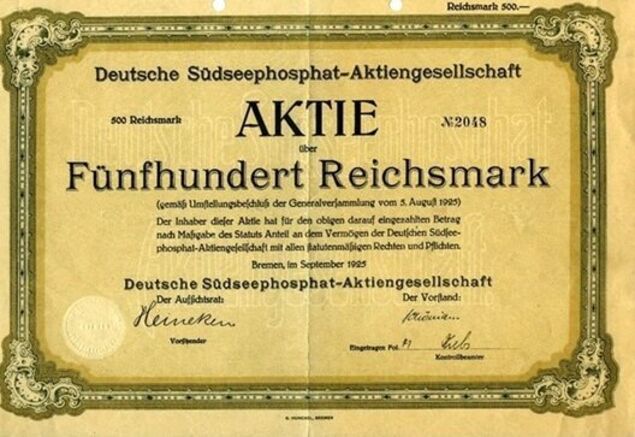 Im Rahmen der kolonialen Expansionsbestrebungen des Kaiserreichs gelangt 1899 das Palau-Archipel im Pazifik in deutschen Besitz, dessen südlichste Insel Angaur heißt. Nachdem dort Phosphorit entdeckt worden ist, wird 1908 in Bremen die Deutsche Südseephosphat-Aktiengesellschaft für dessen Abbau gegründet.