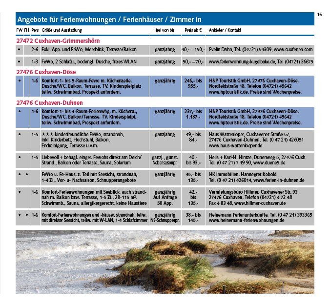 • 2-6 Exkl. App. und FeWo, Meerblick, Terrasse/Balkon ganzjährig 40,- – 150,- Evelin Dähn, Tel. (04721) 54309, www.cuxferien.com