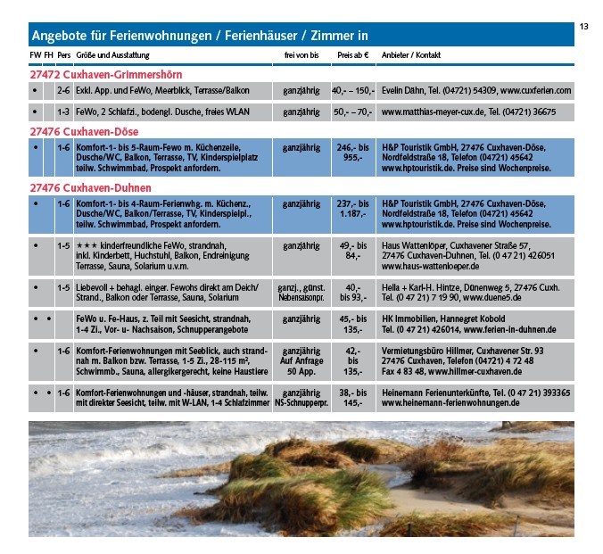 • 2-6 Exkl. App. und FeWo, Meerblick, Terrasse/Balkon ganzjährig 40,- – 150,- Evelin Dähn, Tel. (04721) 54309, www.cuxferien.com
