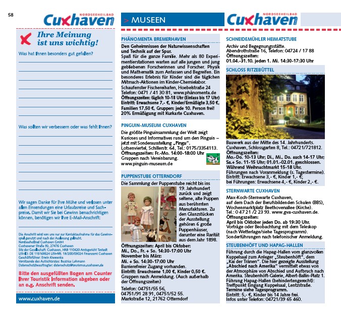 Cuxhaven, Schlossgarten 8, Tel.: 04721/721812.