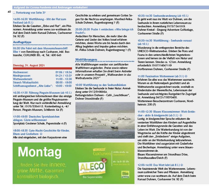 Aufgrund der Corona-Pandemie sind Änderungen vorbehalten! Montag