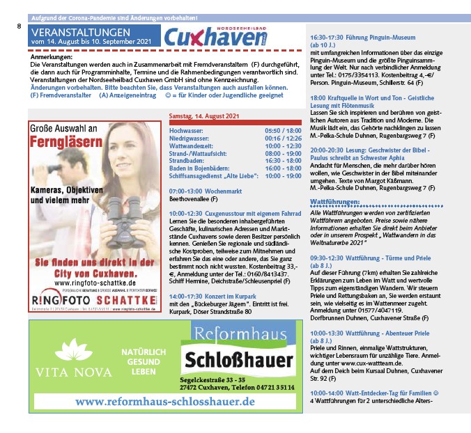 Aufgrund der Corona-Pandemie sind Änderungen vorbehalten! Samstag, 14. August 2021