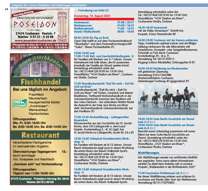 Aufgrund der Corona-Pandemie sind Änderungen vorbehalten! Donnerstag, 13. August 2020