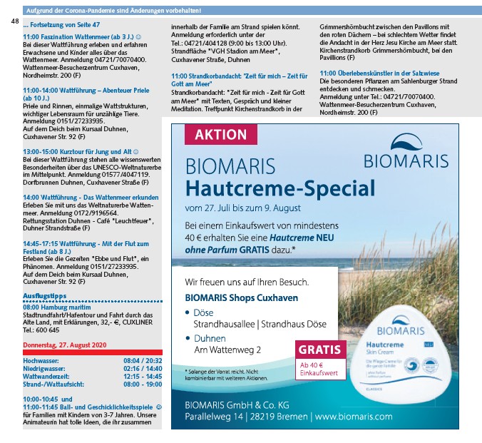 Aufgrund der Corona-Pandemie sind Änderungen vorbehalten! 11:00 Faszination Wattenmeer (ab 3 J.)