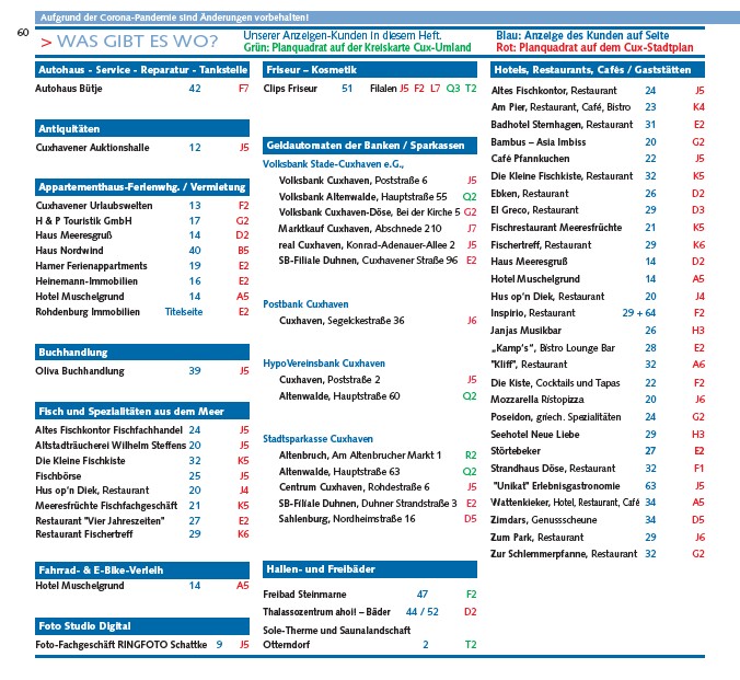 Aufgrund der Corona-Pandemie sind Änderungen vorbehalten! > WAS GIBT ES WO? Blau: Anzeige des Kunden auf Seite