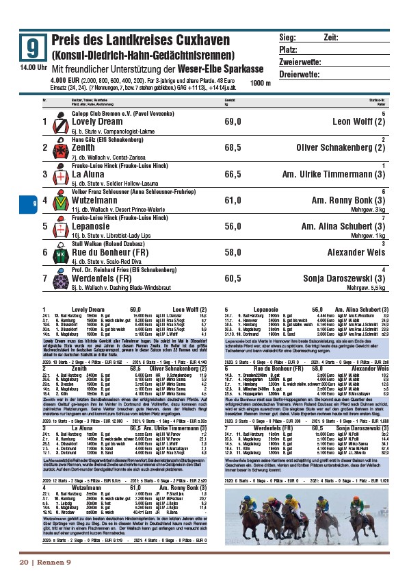 Mit Unterstützung der Weser-Elbe Sparkasse – Ausgleich IV F, 4.000 Euro, 1900 m, Start: 14.00 Uhr