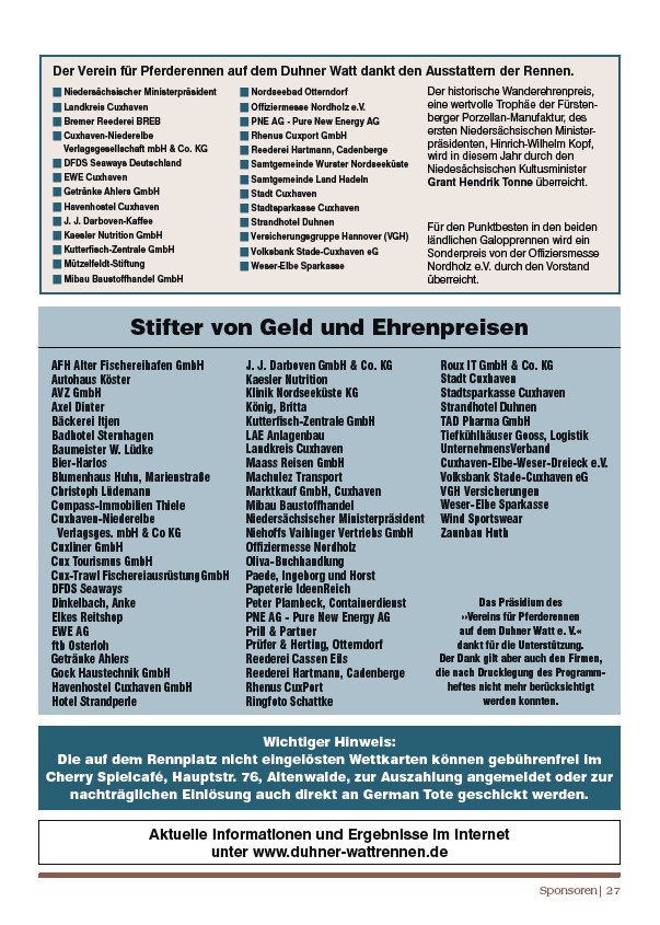 Der Verein für Pferderennen auf dem Duhner Watt dankt den Ausstattern der Rennen.