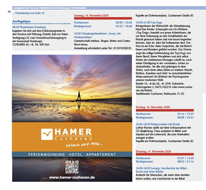 Schlossgarten 2, 04721/62213 oder www.cuxhaven.
