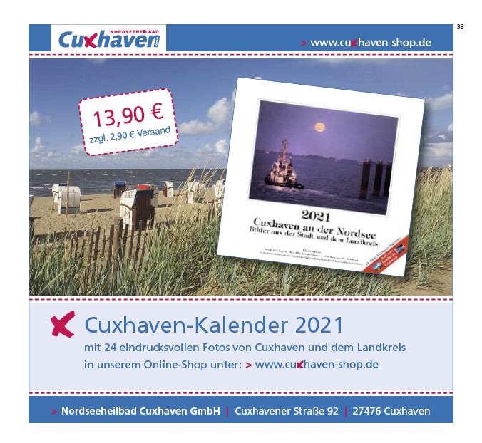 33 13,90 € zzgl. 2,90 €Versand Cuxhaven-Kalender 2021 mit 24 eindrucksvollen Fotos von Cuxhaven und dem Landkreis in unserem Online-Shop unter: > Nordseeheilbad Cuxhaven GmbH | Cuxhavener Straße 92 | 27476 Cuxhaven