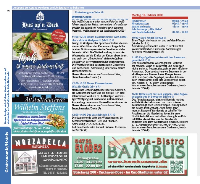 Aufgrund der Corona-Pandemie sind Änderungen vorbehalten! Montag, 12. Oktober 2020