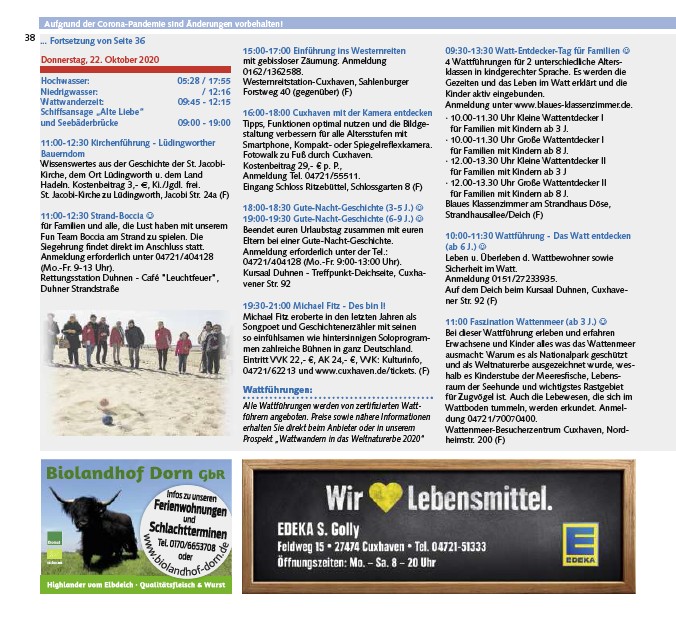 Aufgrund der Corona-Pandemie sind Änderungen vorbehalten! Donnerstag, 22. Oktober 2020