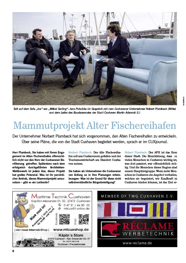Talk auf dem Sofa „Ina“ von „Möbel Gerling“: Jens Potschka im Gespräch mit dem Cuxhavener Unternehmer Nobert Plambeck (Mitte)