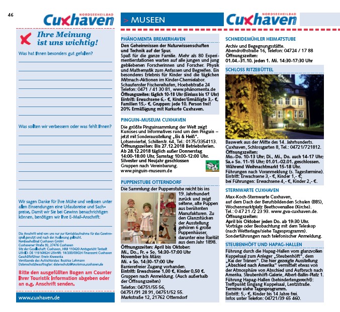 Cuxhaven, Schlossgarten 8, Tel.: 04721/721812.