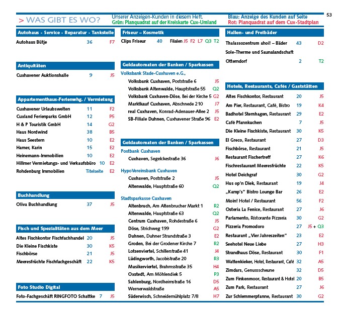 > Was gibt es wo? Blau: Anzeige des Kunden auf Seite