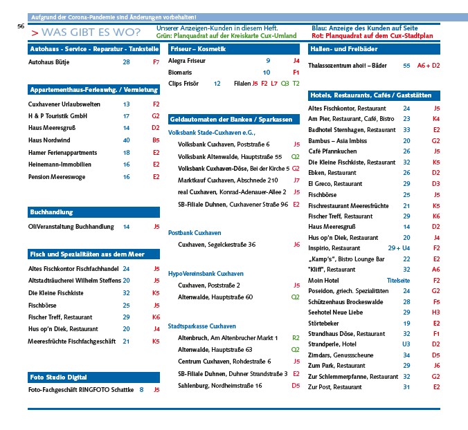 Aufgrund der Corona-Pandemie sind Änderungen vorbehalten! > Was gibt es wo? Blau: Anzeige des Kunden auf Seite
