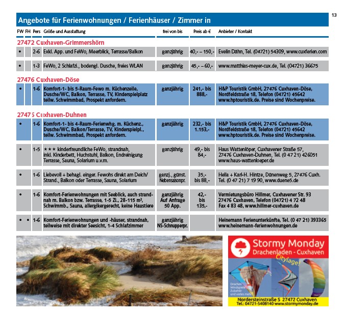 • 2-6 Exkl. App. und FeWo, Meerblick, Terrasse/Balkon ganzjährig 40,- – 150,- Evelin Dähn, Tel. (04721) 54309, www.cuxferien.com