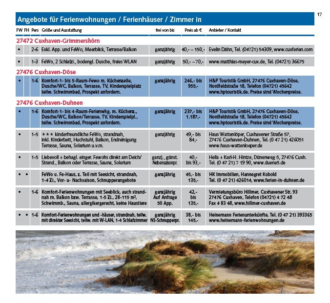 • 1-6 Komfort-1- bis 5-Raum-Fewo m. Küchenzeile, ganzjährig 246,- bis H&P Touristik GmbH, 27476 Cuxhaven-Döse,