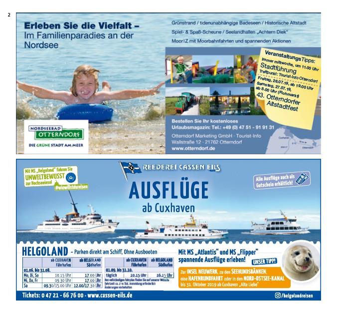 2 VeranstaltungsTipps: Immer mittwochs, um 11.00 Uhr Stadtführung Treffpunkt: Tourist-Info Otterndorf Freitag, 26.07.19, ab 19.00 Uhr Samstag, 27.07.19, ab 8.00 Uhr (Flohmarkt) 43. Otterndorfer Altstadtfest