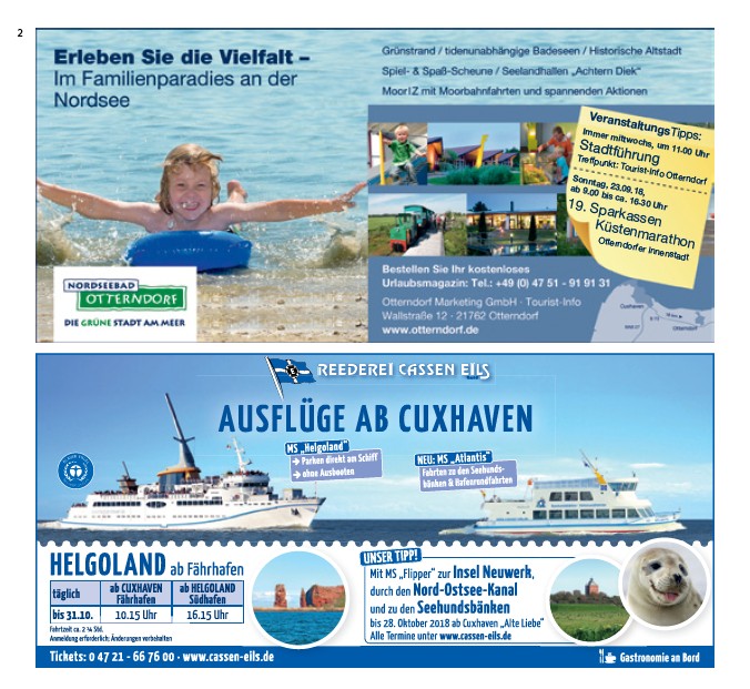 2 VeranstaltungsTipps: Immer mittwochs, um 11.00 Uhr Stadtführung Treffpunkt: Tourist-Info Otterndorf Sonntag, 23.09.18, ab 9.00 bis ca. 16.30 Uhr 19. Sparkassen Küstenmarathon Otterndorfer Innenstadt