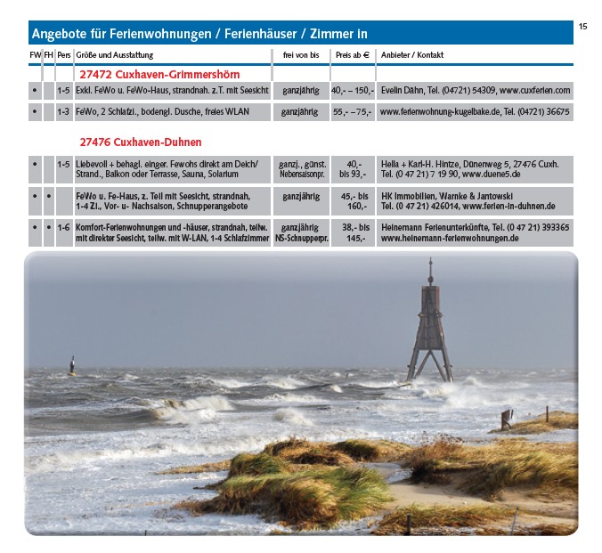 • 1-5 Exkl. FeWo u. FeWo-Haus, strandnah. z.T. mit Seesicht ganzjährig 40,- – 150,- Evelin Dähn, Tel. (04721) 54309, www.cuxferien.com