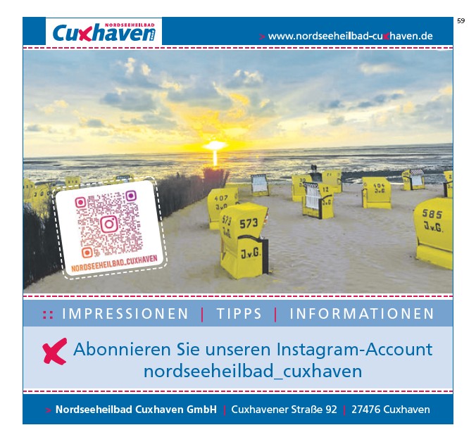 59 : : IMPRESSIONEN | TIPPS | INFORMATIONEN Abonnieren Sie unseren Instagram-Account nordseeheilbad_cuxhaven > Nordseeheilbad Cuxhaven GmbH | Cuxhavener Straße 92 | 27476 Cuxhaven