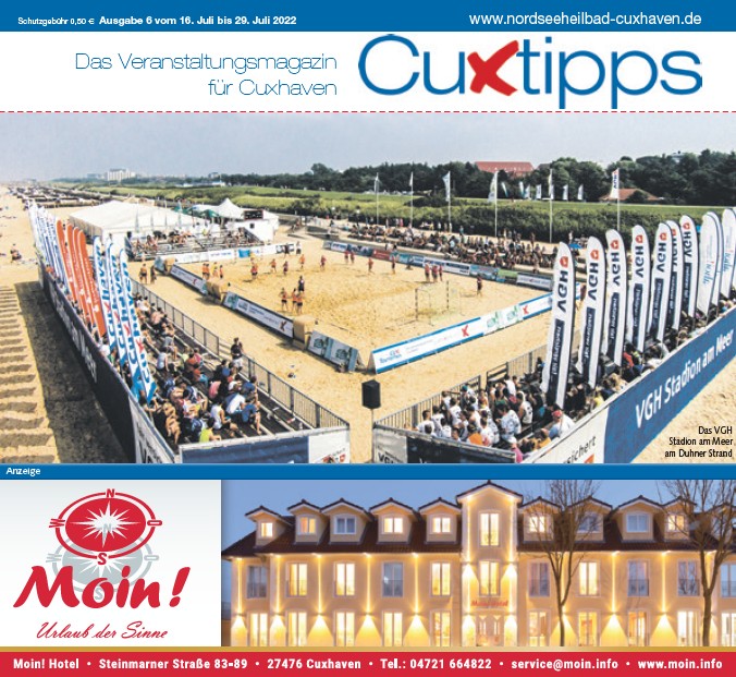 1 Schutzgebühr 0,50 J Ausgabe 6 vom 16. Juli bis 29. Juli 2022 www.nordseeheilbad-cuxhaven.de Das Veranstaltungsmagazin für Cuxhaven Anzeige Das VGH Stadion am Meer am Duhner Strand