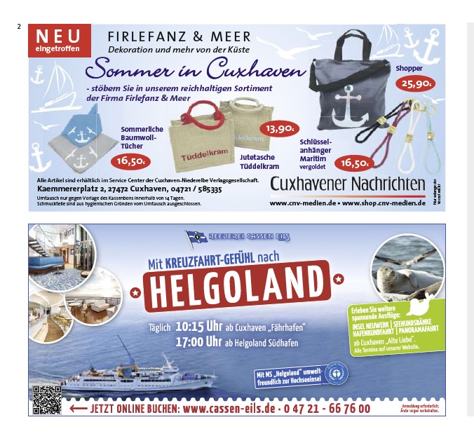 Alle Artikel sind erhältlich im Service Center der Cuxhaven-Niederelbe Verlagsgesellschaft.