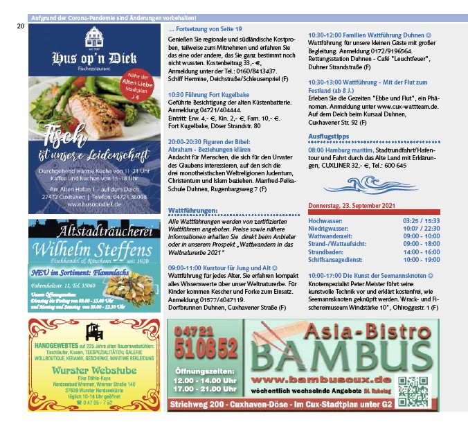 Aufgrund der Corona-Pandemie sind Änderungen vorbehalten! 10:30-12:00 Familien Wattführung Duhnen J