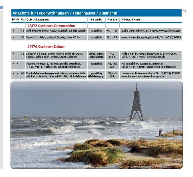 1-5 Exkl. FeWo u. FeWo-Haus, strandnah. z.T. mit Seesicht ganzjährig 40,- – 150,- Evelin Dähn, Tel. (04721) 54309, www.cuxferien.com