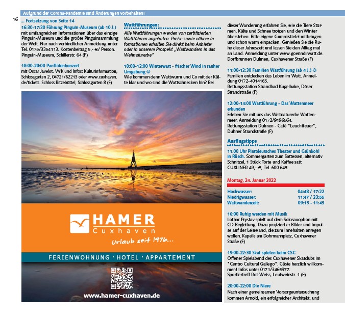Schlossgarten 2, 04721/62213 oder www.cuxhaven.