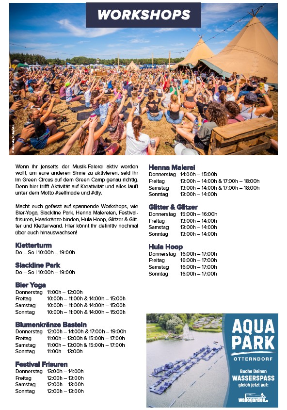 Bier-Yoga, Slackline Park, Henna Malereien, Festivalfrisuren,