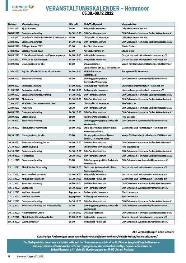 Kurzfristige Änderungen unter www.hemmoor.de/leben-wohnen/freizeit-kultur/veranstaltungen/