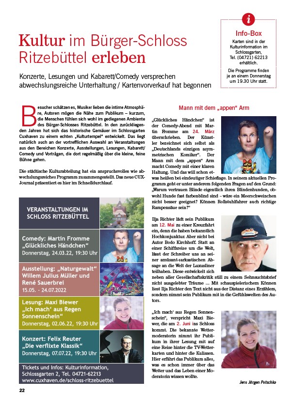 aus den Bereichen Konzerte, Ausstellungen, Lesungen, Kabarett/