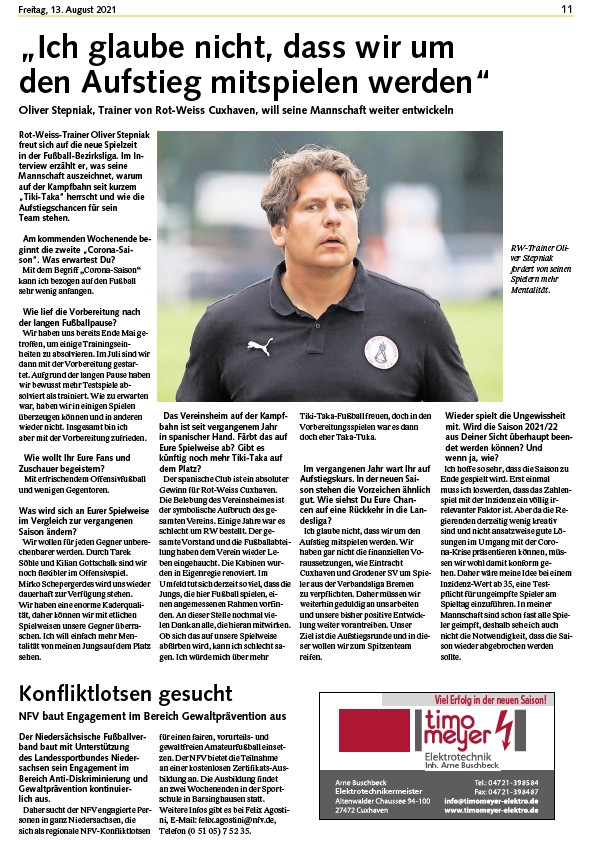 Oliver Stepniak, Trainer von Rot-Weiss Cuxhaven, will seine Mannschaft weiter entwickeln