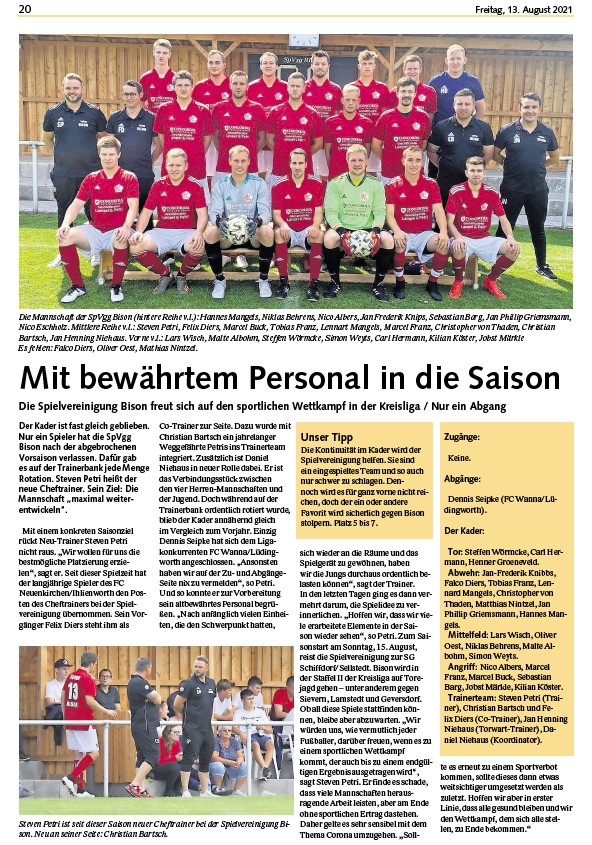 Die Spielvereinigung Bison freut sich auf den sportlichen Wettkampf in der Kreisliga / Nur ein Abgang