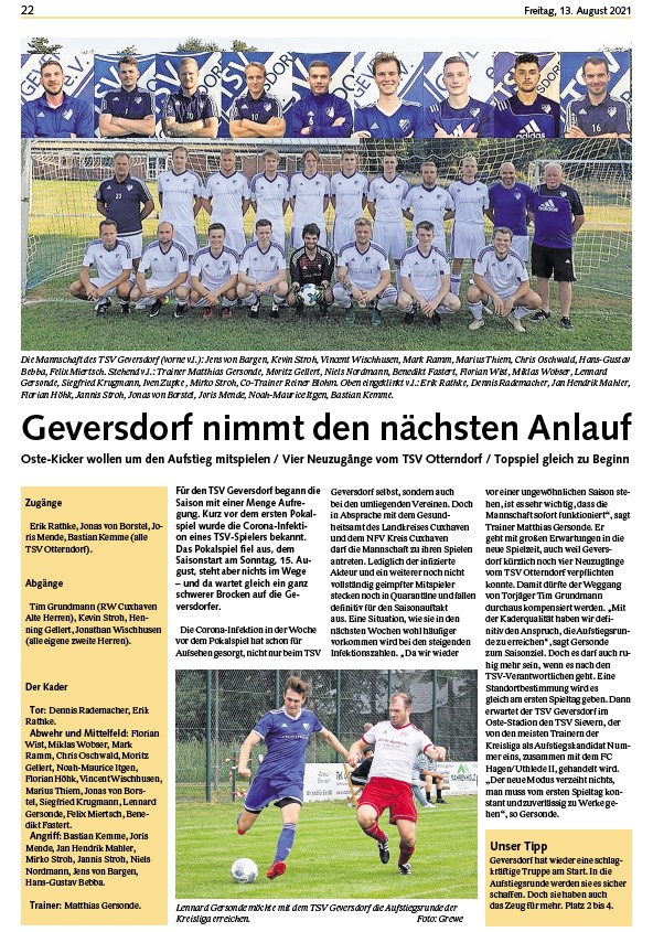 Oste-Kicker wollen um den Aufstieg mitspielen / Vier Neuzugänge vom TSV Otterndorf / Topspiel gleich zu Beginn