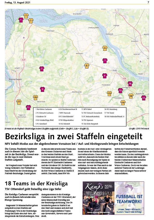 Erneut ist die Fußball-Bezirksliga in zwei Staffeln aufgeteilt (Gelb = Staffel I, Lila = Staffel II). Grafik: CNV/Wienzek