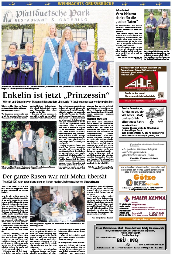 Elisa Hustedt, Enkelin von Wilhelm und Geraldine von Thaden, wurde Prinzessin beim „Plattdeutschen Volksfest Verein“. Im September fuhr sie bei der Steubenparade