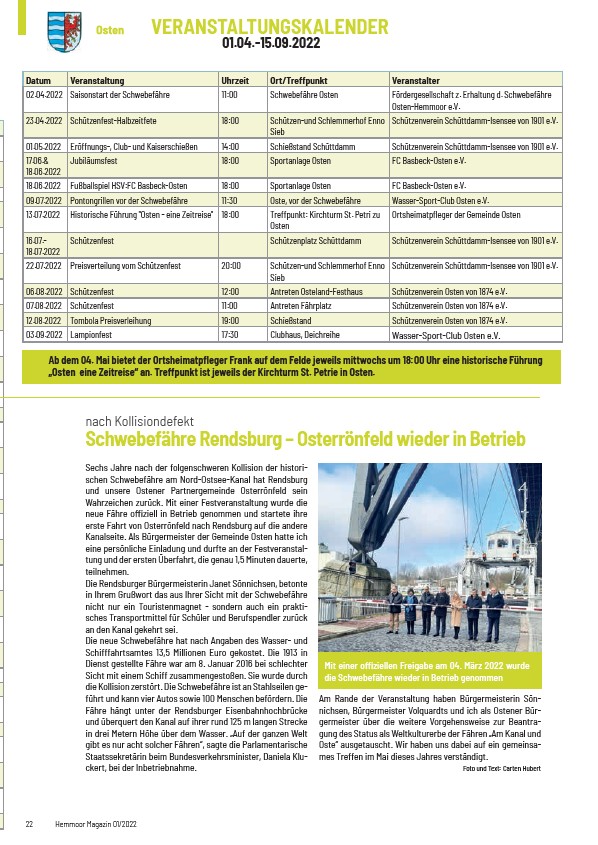 02.04.2022 Saisonstart der Schwebefähre 11:00 Schwebefähre Osten Fördergesellschaft z. Erhaltung d. Schwebefähre