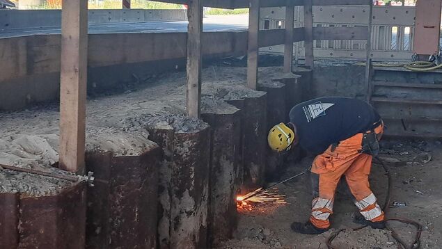 Unterdessen werden derzeit die letzten Spundwände am Fahrbandrand abgeschweißt, die die Ränder der Baugrube für das Brückenfundament gesichert hatten. Danach kann die Baugrube wieder aufgefüllt und der Fußgängerweg sowie der Fahrradweg wieder hergestellt werden.