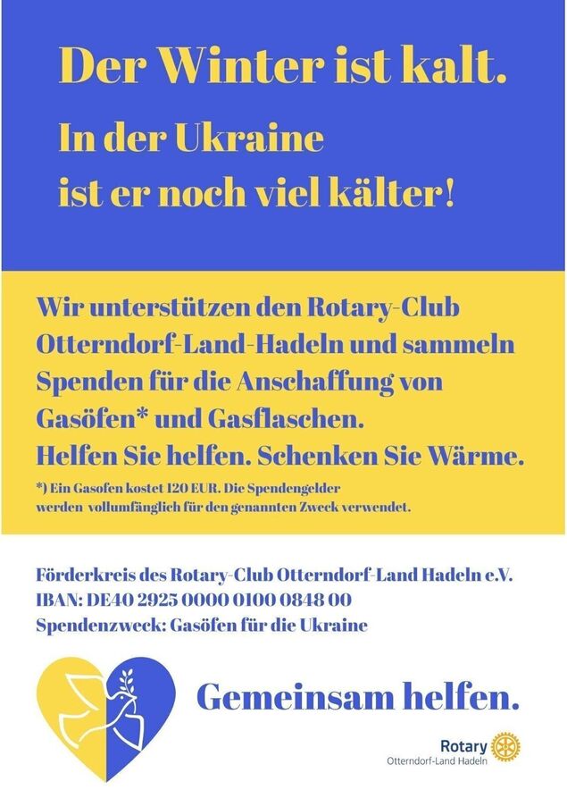 Spendenempfänger ist der Förderkreis des Rotary Clubs Otterndorf-Land Hadeln e.V., die IBAN lautet: DE40 2925 0000 0100 0848 00, Zweck: Gasöfen für die Ukraine.