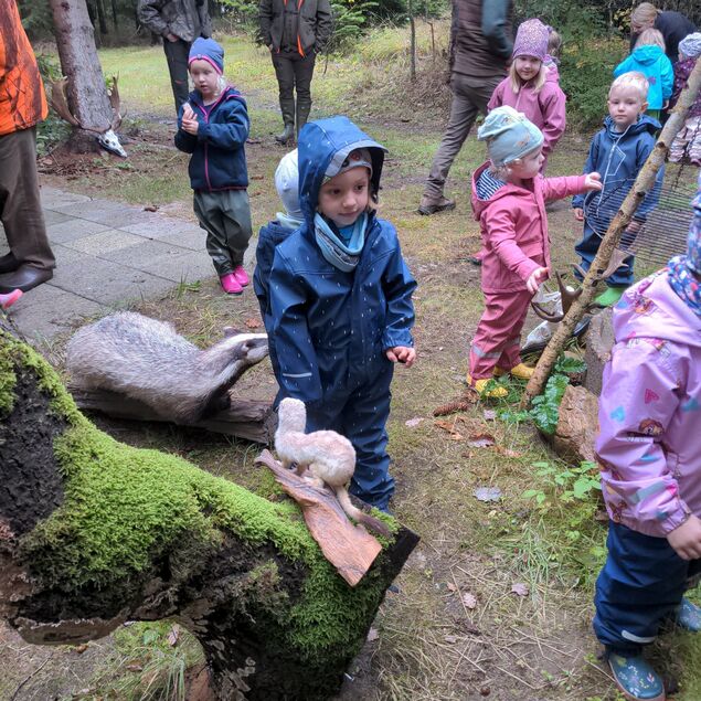 In einer Waldhütte startete der Tag gemütlich mit einem gemeinsamen Frühstück, und unter dem Motto "Wer isst was?" bekamen die Kinder Basiswissen über die Fressgewohnheiten der Waldtiere vermittelt. Anschließend wurden verschiedene Tierpräparate gezeigt und erklärt: Die Kinder bestaunten Reh, Dachs, Wiesel & Co. aus nächster Nähe.