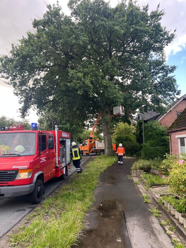 Heftiger Starkregen im Bereich Bülkau hat am Wochenende für einen Feuerwehreinsatz gesorgt. Das Unwetter brachte am Sonnabendmorgen (2. August 2025) einige starke Böen. An einer stark belaubten Eiche brach dabei ein dicker Ast aus der Baumkrone.