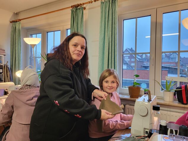Es herrscht Konzentration unter den Näherinnen. Unterhalten wird sich zwischendurch natürlich trotzdem. "Das Soziale hinterher ist auch wichtig", betont Marunde. Normalerweise wird zwei Stunden lang genäht und danach gemeinsam Kaffee getrunken. Oft bringen die Frauen etwas zu Essen aus ihrer Heimat mit. Dabei wird sich über alles Mögliche ausgetauscht. Es komme aber auch vor, dass alle lieber weiterarbeiten wollen, erzählt sie. "Die Zeit ist immer so schnell um", ergänzt Hüttig. In der Nähstube gibt es auch Spiele. Manchmal bringen die Frauen auch ihre Kinder mit, erzählt die gelernte Damenschneiderin.