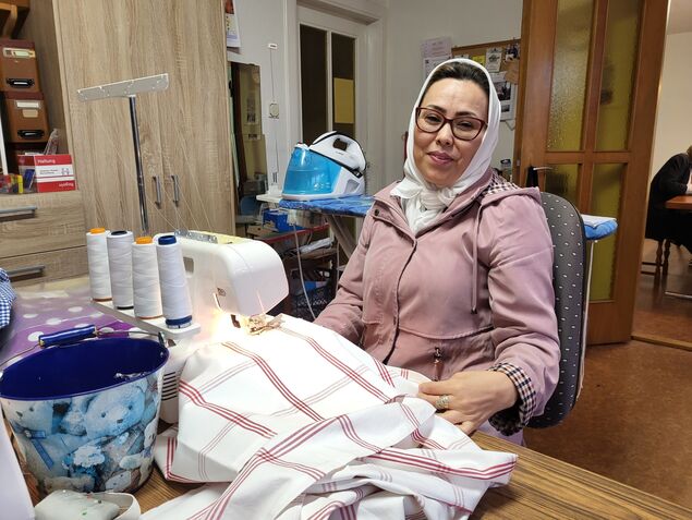 Seit zwei Monaten kommt Aziza Jafari in die Nähstube. "Ich möchte mit Leuten sprechen und mein Deutsch verbessern. Und natürlich Nähen", erzählt sie. In Deutschland lebt sie ungefähr seit vier Jahren, gebürtig kommt sie aus Afghanistan. Gerade näht Jafari Geschirrhandtücher für die Küche. Vorher habe sie bereits ein bisschen Erfahrung beim Nähen gehabt, sie möchte sich aber verbessern, erklärt sie.