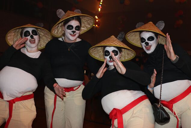Mittendrin im Karnevalstrubel: vier weibliche Kung-Fu-Pandabären. Sie sorgten mit Strohhüten, schwarz-weißen Gesichtern und voluminösen Bäuchen für Aufsehen und landeten in der Gruppenbewertung auf dem dritten Rang. Der zweite Platz ging an die Quallendamen, die mit Hai und Seejungfrauen im Schlepptau vergnügt durch die Partynacht plätscherten.