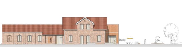 Auf der linken Gebäudeseite soll ein neuer Anbau, eine Art Wintergarten, entstehen, der sich optisch vom Altbau abhebt und für gastronomische Zwecke genutzt werden kann. Dort können sich sowohl Reisende als auch Einheimische aufhalten. Zum neuen Anbau gehört auch eine Außenfläche, die ebenfalls für die Gastronomie genutzt werden kann. Dieser Bereich geht in ein öffentliches Gelände mit Sitzgelegenheiten, Staudenbeeten und einem parkähnlichen Charakter über. Die Fahrradabstellanlage wechselt die Seite und kommt auf die Fläche des dann abgerissenen Gebäudeteils.