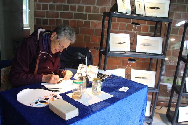 Sorgenvolle Blicke richtete auch Ingeburg Burghard auf ihre Exponate. Sie saß zwar in der Scheune, aber das Papier ihrer gerahmten kleinen Kunstwerke drohte, wegen Feuchtigkeit wellig zu werden. Seit bestimmt zehn Jahren ist die Bremerhavener Vogelfreundlin Ausstellerin auf dem Taubenhof in Cadenberges und zog auch diesmal wieder zahlreiche Blicke auf ihre besonderen Arbeiten. Sie bemalt filigran Vogelfedern mit der entsprechenden Vogelart.