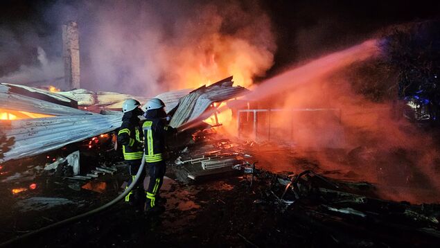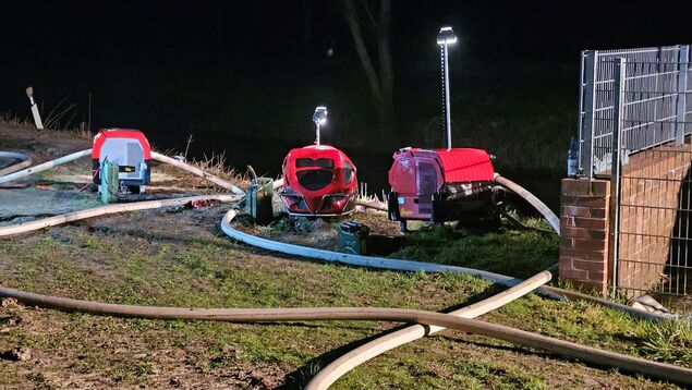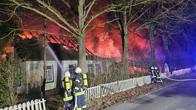 Besonders problematisch war das Nebengebäude: Dessen Blechdach hielt der enormen Hitze nicht stand und stürzte ein, wodurch sich Glutnester unter den Trümmern bildeten. Um diese erreichen zu können, musste ein Bagger eingesetzt werden, der die schweren Metallteile auseinanderzog. Zusätzlich kam ein sogenannter Dachmonitor der Feuerwehr Cadenberge zum Einsatz - ein leistungsstarkes Wasserwerfersystem, das aus erhöhter Position gezielt große Mengen Löschwasser auf das Brandobjekt abgeben kann.