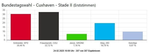 Die Spannung im Wahlkreis Cuxhaven-Stade II hat ein Ende. CDU-Kandidat Christoph Frauenpreiß zieht in den Bundestag ein und verdrängt den bisherigen SPD-Abgeordneten Daniel Schneider. Die endgültigen Wahlergebnisse.